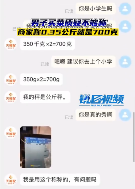 之后两人就千克与克之间的换算产生了争执,该商家还将自己所用的电子秤拍了照片过来,说它不可能出错,还多次强调这是公斤秤,公斤与市斤是不同的,0.35千克就是700克。最后双方的争执也就不了了之了。